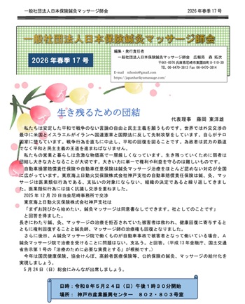 日本のどこでも、いつでも、誰でも、お金に心配なく健康保険で鍼灸マッサージを受診できること、国民と患者の受診の権利と生活と営業を守ることを目指しています。